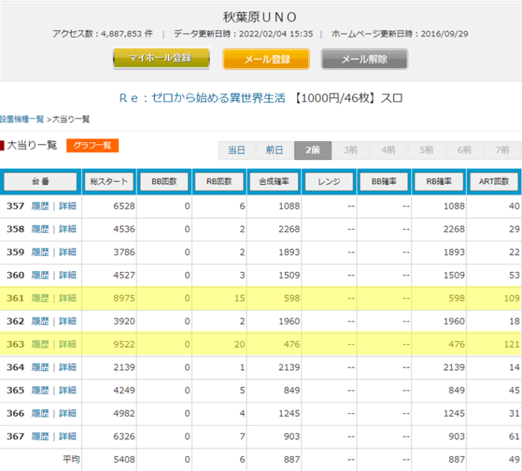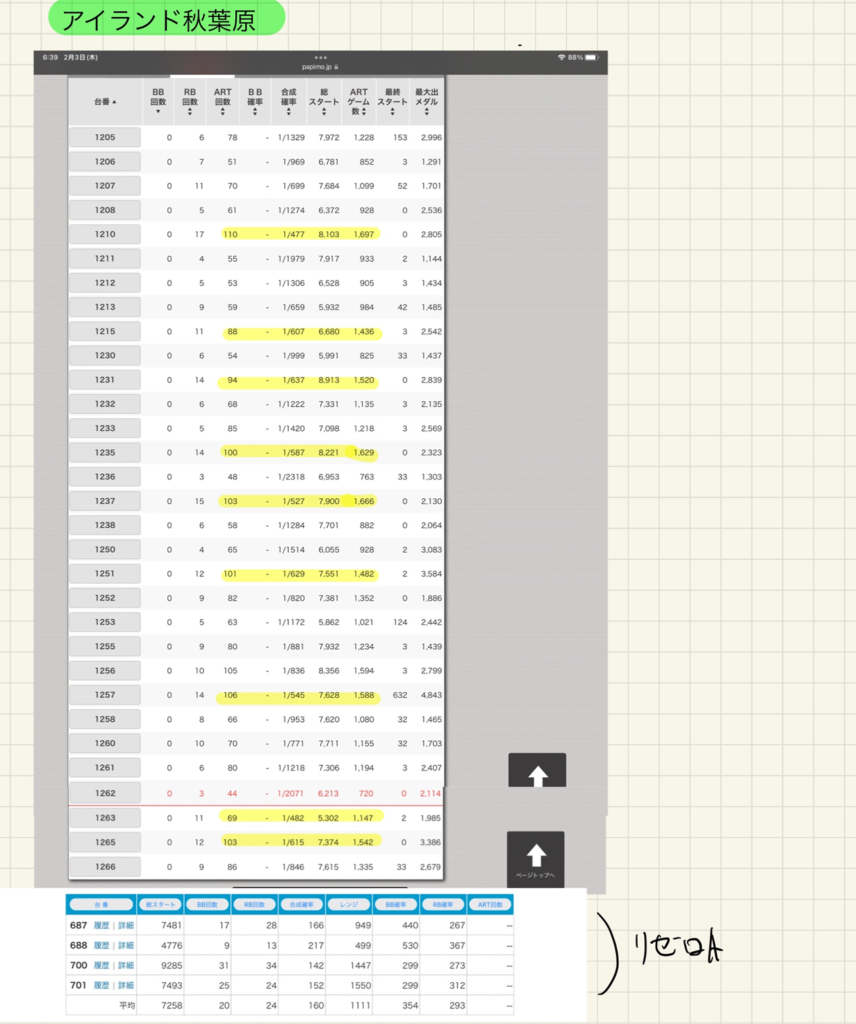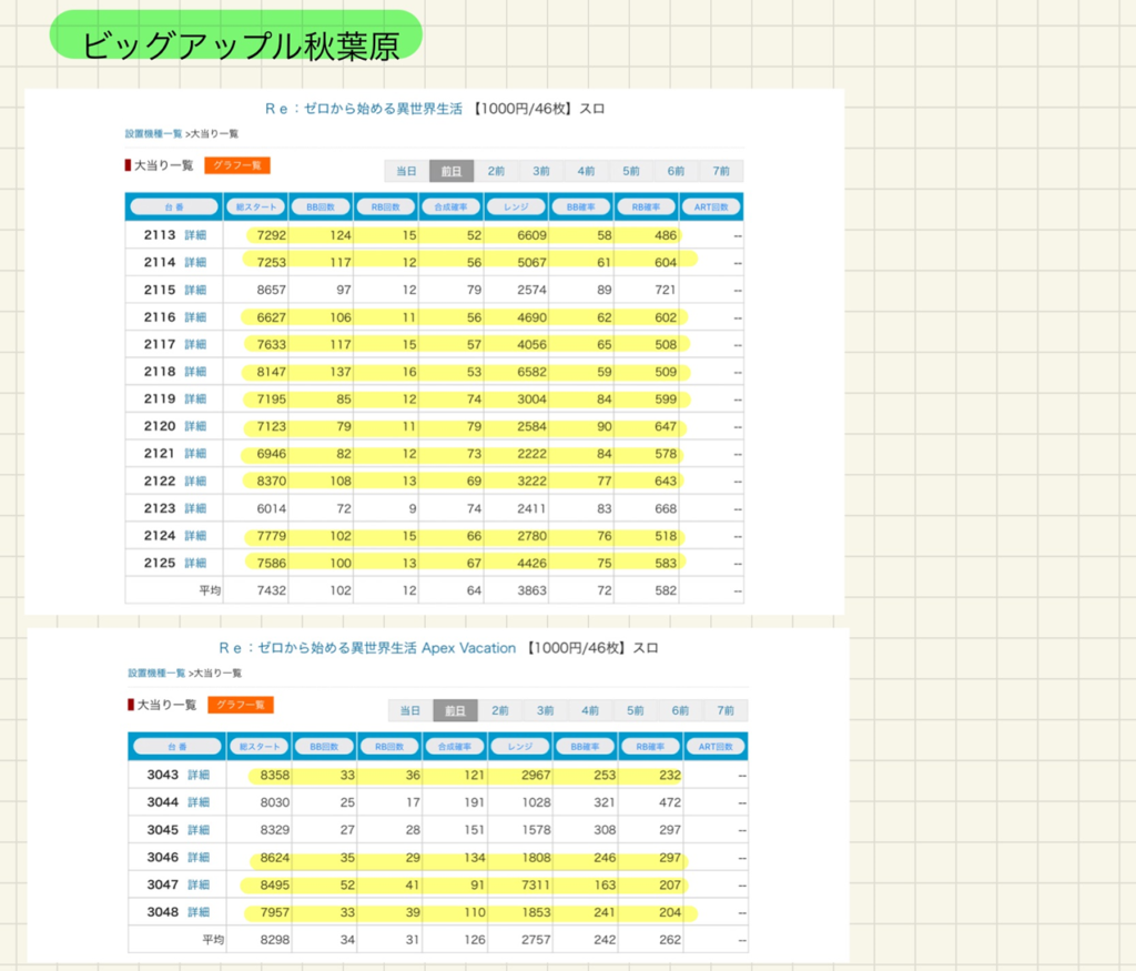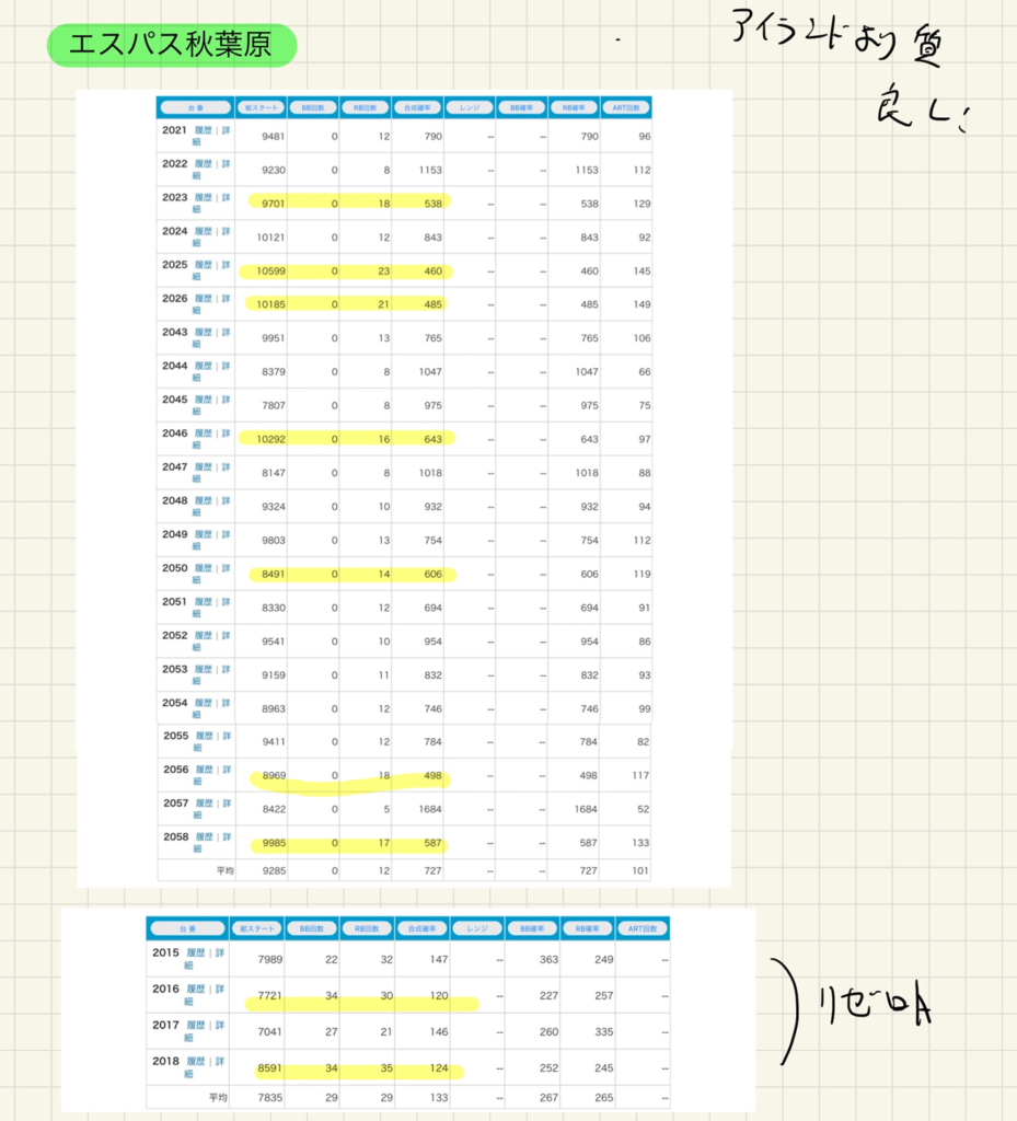 ↓ 各店舗データ一覧です。初当たり1/600以上を黄色の蛍光ペンで色付けしています