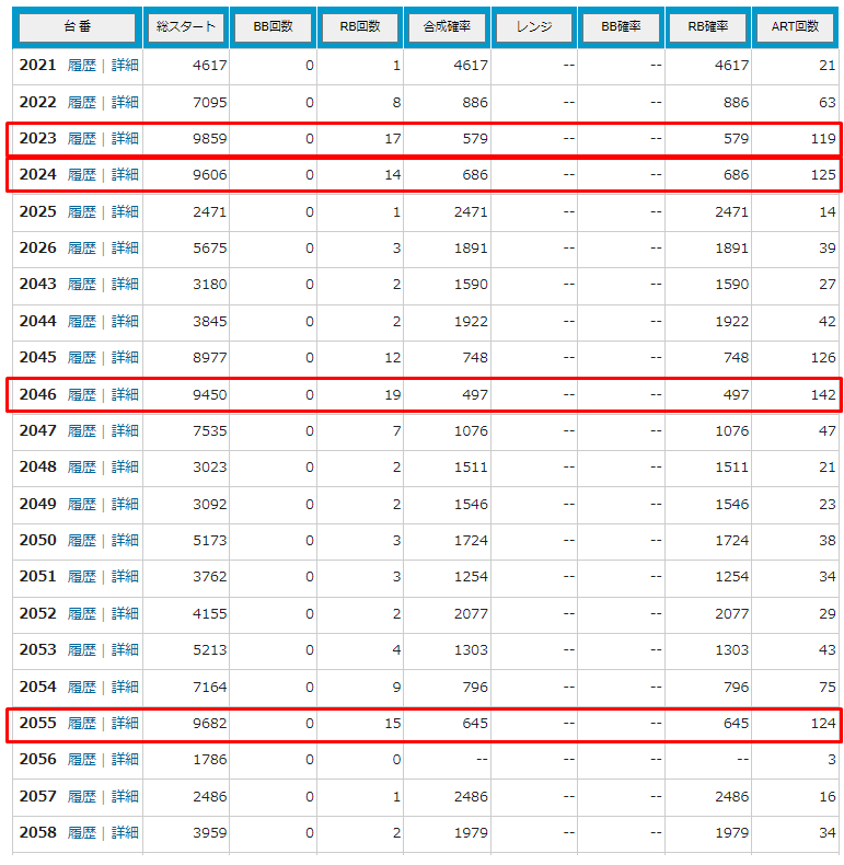 画像内赤枠は初当たり確率が1/700を上回った台です