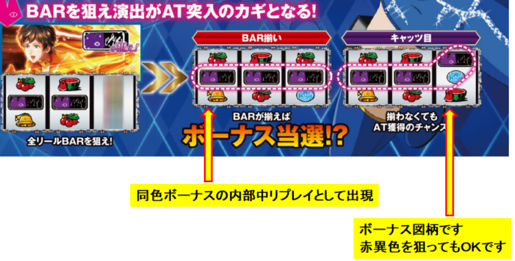 ただし、異色ボーナスに関してはボーナスとしては見せずにキャッツ目としてみせATのチャンスを演出しています
