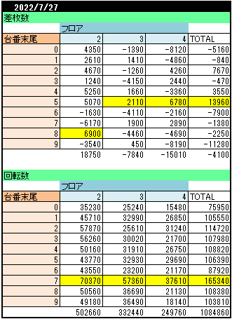 | 差枚数 | 360枚 (24枚/台) | 10960枚 (731枚/台) | -11610枚 (-774枚/台) |
