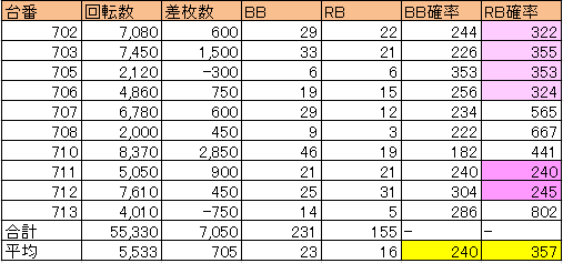 | 差枚 | 7050枚 (705枚/台) |