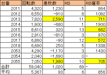 | 差枚 | 6000枚 (545枚/台) |