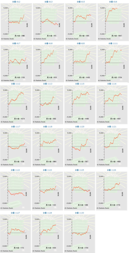 | 差枚数 | 1710枚 (244枚/台) | -3670枚 (-612枚/台) | -3590枚 (-513枚/台) |