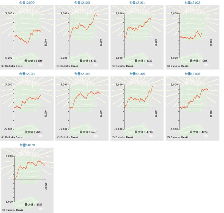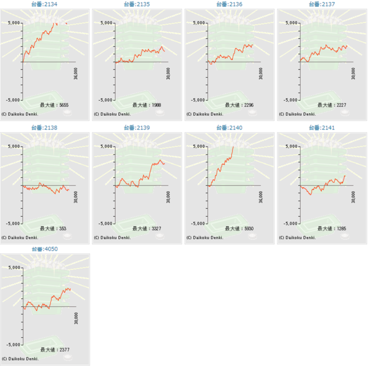| 差枚数 | 2200枚 (37枚/台) | 17850枚 (303枚/台) | 29700枚 (503枚/台) |