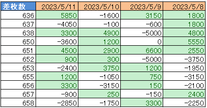 | 差枚 | 5250枚 (477枚/台) |