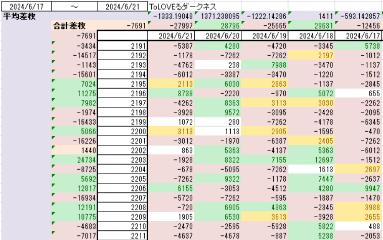 | 差枚 | 6850枚 (214枚/台) |